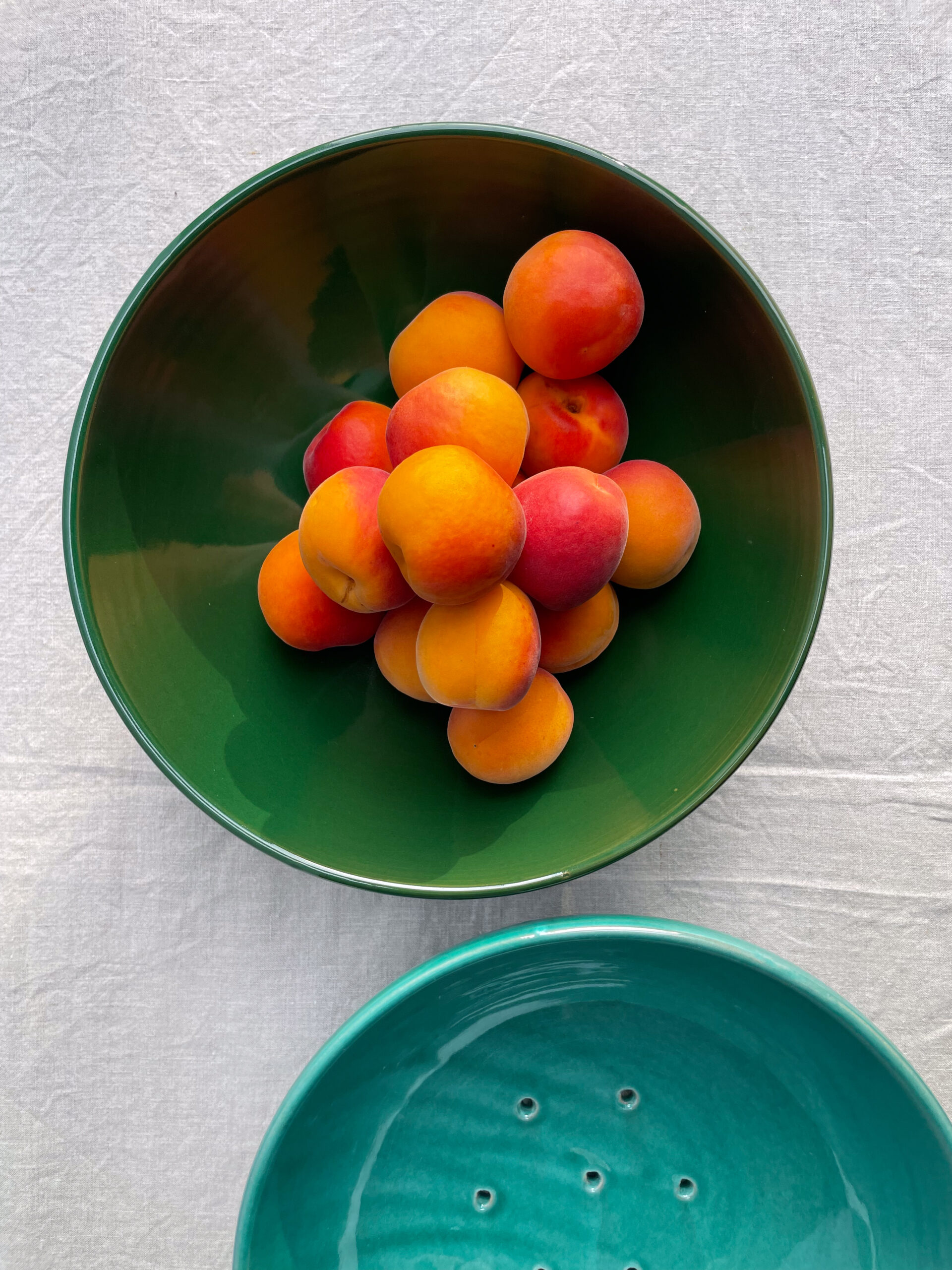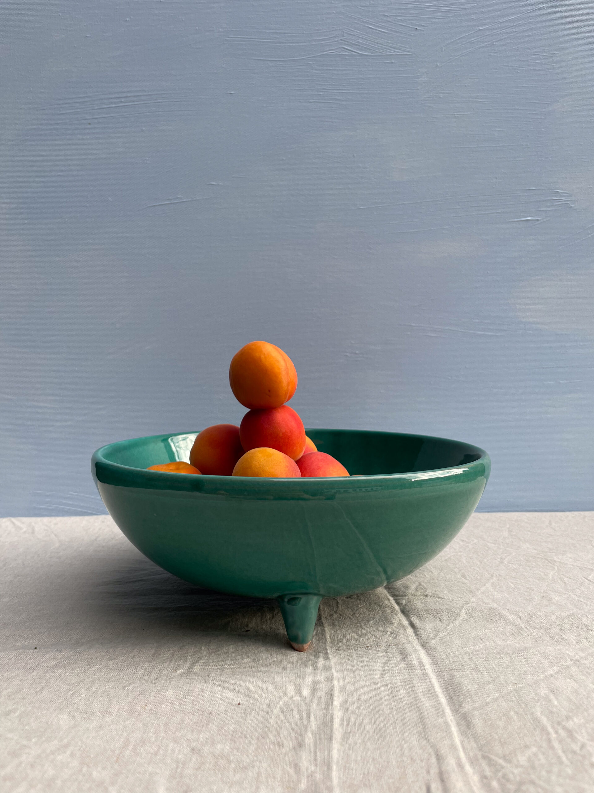Ręcznie robiona, ceramiczna, ceramika z Włoch, misa na owoce, z dziurkami w kolorze butelkowej zieleni, ceramika z Pugli